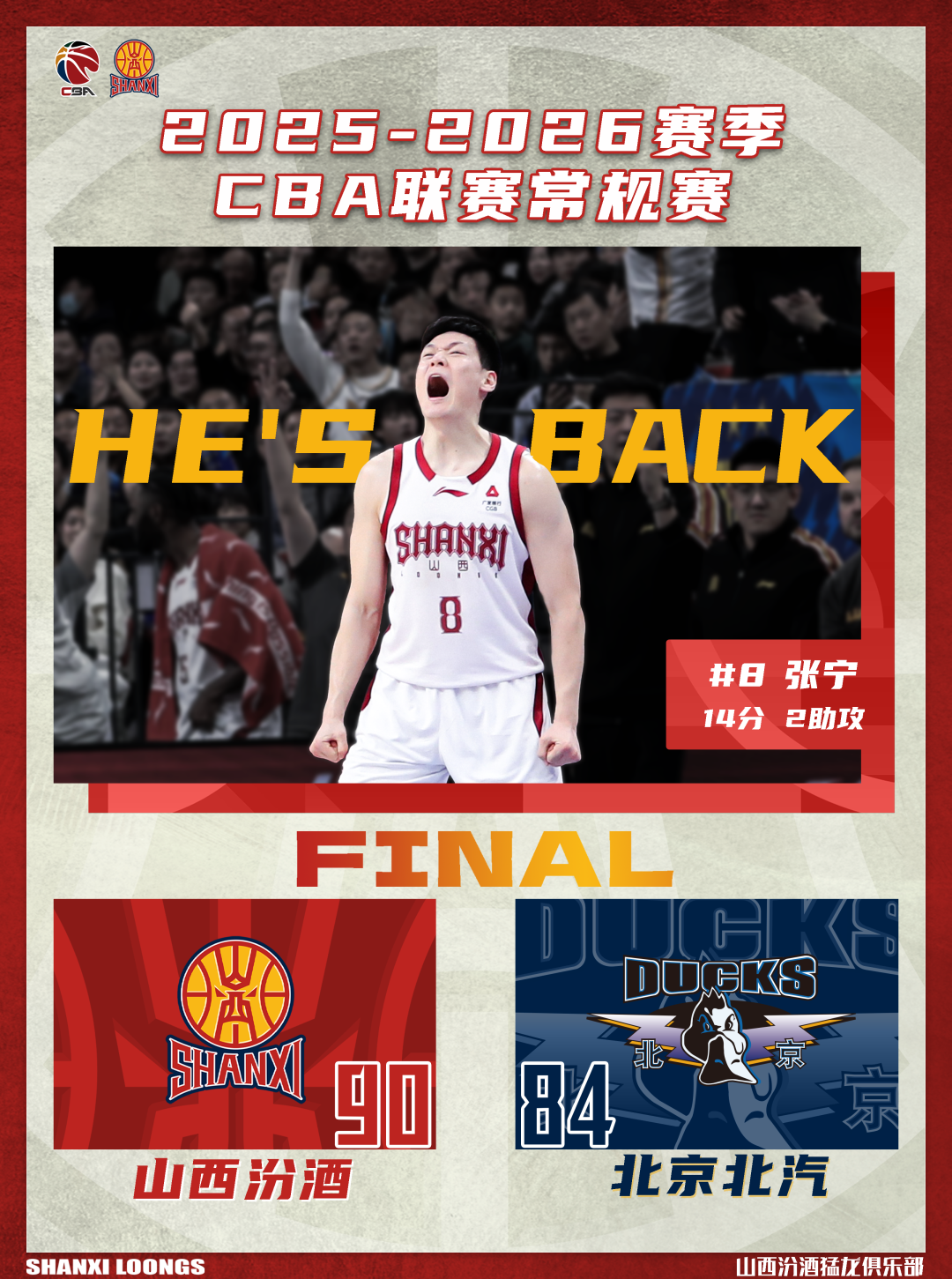 xingkongsports-战报 | 张宁复出 山西汾酒90 : 84力克北京北汽